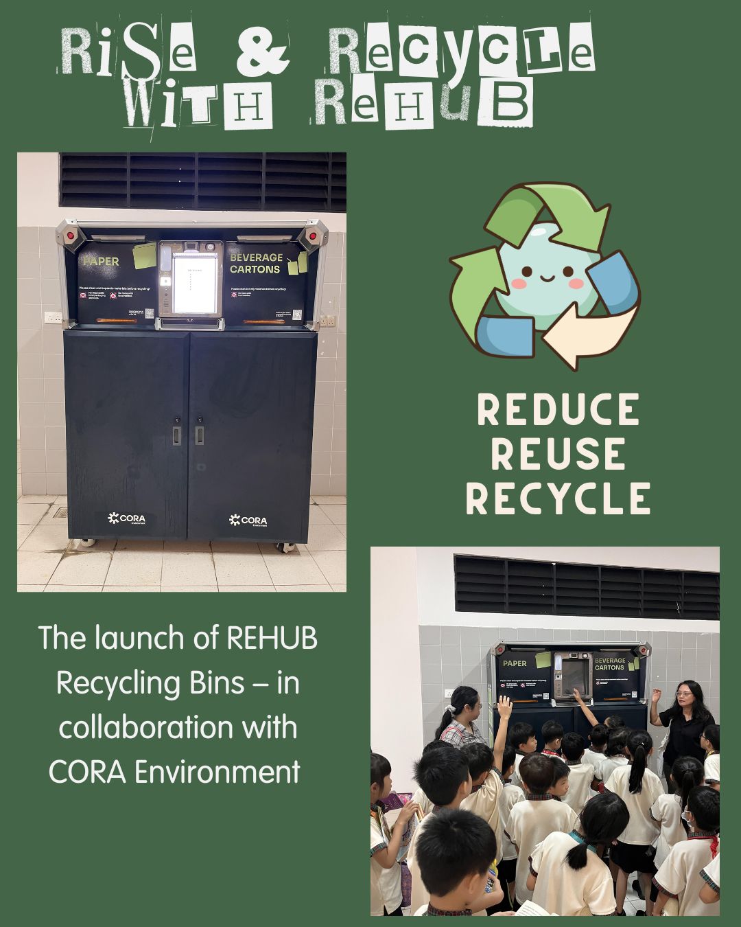 Learning came alive beyond the exhibition. On 21 April, student leaders took the lead at a school assembly, delivering an engaging talk-cum-quiz that sparked curiosity and deepened their peers’ understanding of sustainable practices. The launch of REHUB Recycling Bins – in collaboration with CORA Environment – added another exciting milestone. A short video, created by the LLP team, guided students on how to recycle paper effectively using the recycling bin at the school canteen.
